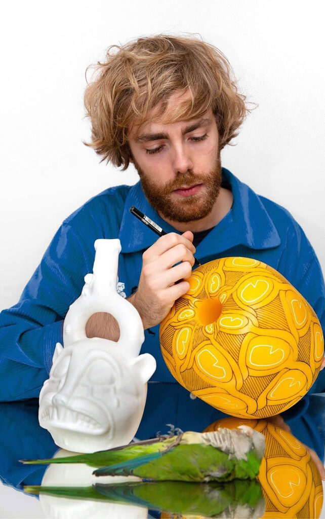 ‘Je n'ai pas de grand atelier pour le moment, ce qui signifie que lorsque je travaille sur un projet plus important, notre maison devient parfois une sorte de vitrine colorée avec toutes sortes de jouets, de masques, de crânes et d'animaux en peluche. Récemment, notre maison a été cambriolée. Toute une série de crânes, que Verbeke m'avait donnés pour travailler, se trouvait exposée dans le salon. Je pense que les voleurs, par pur désarroi, ont laissé derrière eux des objets de valeur tels que mon portefeuille et le sac de mon amie. Ils ont pris mes pantoufles. Mon univers peut être déroutant parfois.’