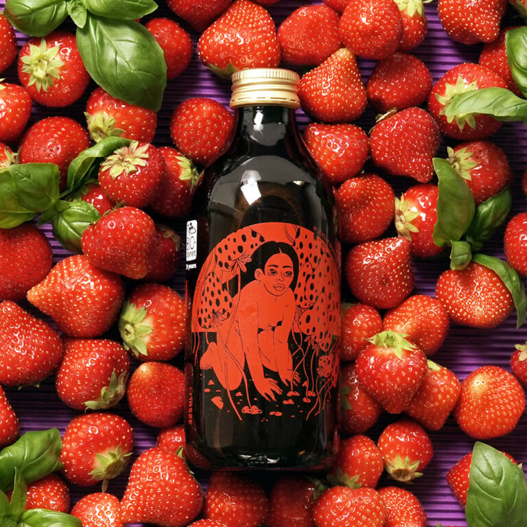 'Sono una grande fan di Yugen e ho trovato molto interessante visualizzare un sapore. All'inizio, sapevo già che volevo usare la fragola che si fonde con il fungo (che collego a uno scoby) nel disegno, ma il resto è venuto abbastanza spontaneamente. Il gusto "Strawberry Basil" mi ha evocato una sensazione di dolcezza, giocosità e sessualità. La miscela è un po' come un afrodisiaco, quindi volevo decisamente una figura misteriosa e sessualmente femminile. Da qui il carattere di ninfa.'