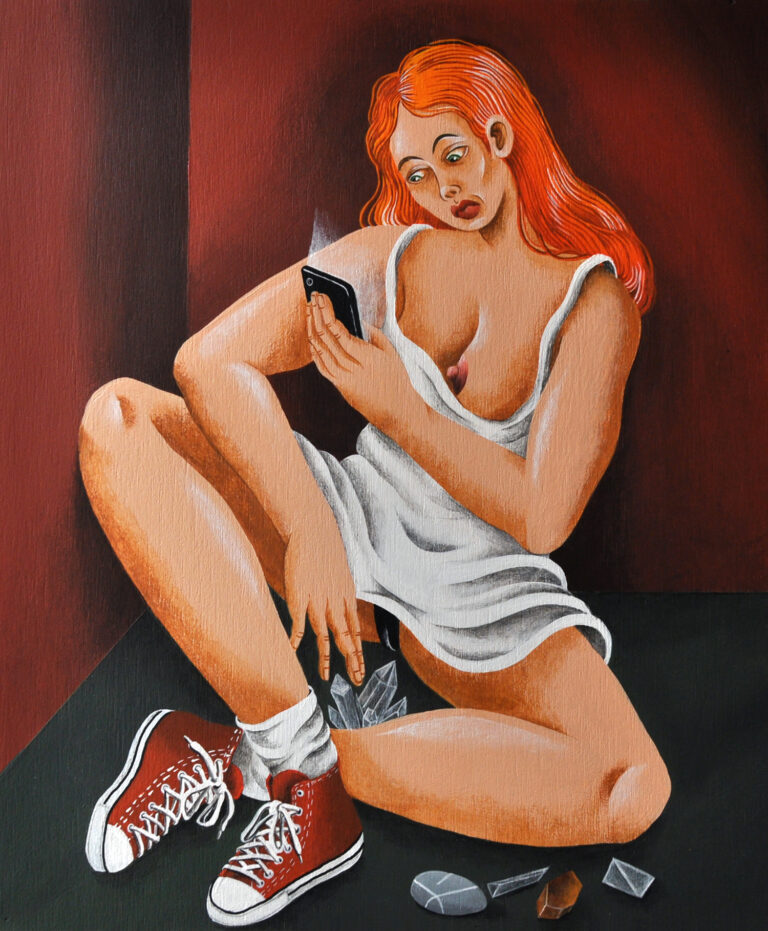 'Si sente spesso dire che la generazione online non può più vivere nel presente e deve essere sempre connessa, consapevole di tutto e di tutti. Questo è vero, naturalmente. Siamo dipendenti dalla velocità di Internet. Se non siamo esposti alla velocità degli stimoli, ci annoiamo. L'ho notato anche su me stessa. Allo stesso tempo, i benefici dei social media sono innegabili. Basta guardare quanto velocemente e bene possiamo informarci su questioni globali, come #MeToo o il bullismo. Ci sono due lati della medaglia, ma il dibattito intorno ai social media è purtroppo spesso troppo polarizzato. Nelle mie opere ho quindi cercato soprattutto di osservare e non di criticare o polarizzare.'