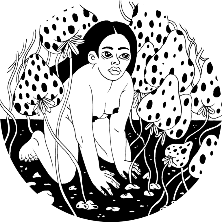 'Sono una grande fan di Yugen e ho trovato molto interessante visualizzare un sapore. All'inizio, sapevo già che volevo usare la fragola che si fonde con il fungo (che collego a uno scoby) nel disegno, ma il resto è venuto abbastanza spontaneamente. Il gusto "Strawberry Basil" mi ha evocato una sensazione di dolcezza, giocosità e sessualità. La miscela è un po' come un afrodisiaco, quindi volevo decisamente una figura misteriosa e sessualmente femminile. Da qui il carattere di ninfa.'